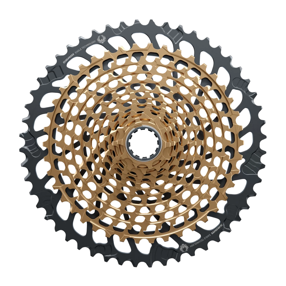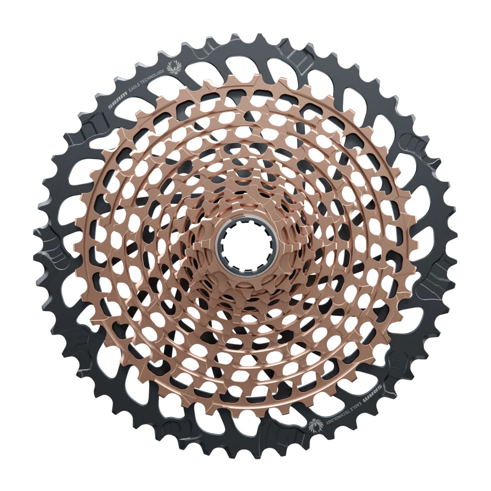 Whether for prized race machines or the build of their dreams, the XG-1299 cassette is the ultimate, giving riders unprecedented 520-percent range thanks to the new 10-52 tooth-span. Stronger racers are now free to choose larger chainrings for more top-end speed, without sacrificing climbing range. More time is spent higher up in the cassette where athletes power transfer is most efficient and wear is minimized. Featuring the industry’s strongest X-Dome™ architecture and proven XD™ driver body, it’s also backwards compatible to give riders even more Eagle™ upgrade options for their current bikes. With multiple Olympic, World Cup and World Championship titles, it also matches up perfectly to XX1 Eagle AXS™ enabled componentry. The XG-1299 cassette utilizes the full depth of the new Eagle™ Colorsystem. Available in Black to Gold to Rainbow and all-new Copper, the XG-1299 cassette completes the expression of the worlds most accomplished and sought after bikes.
