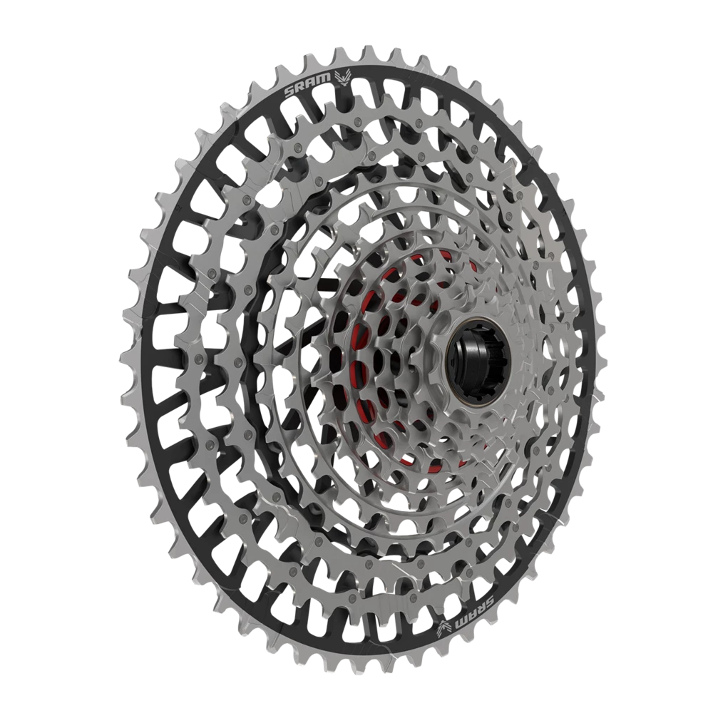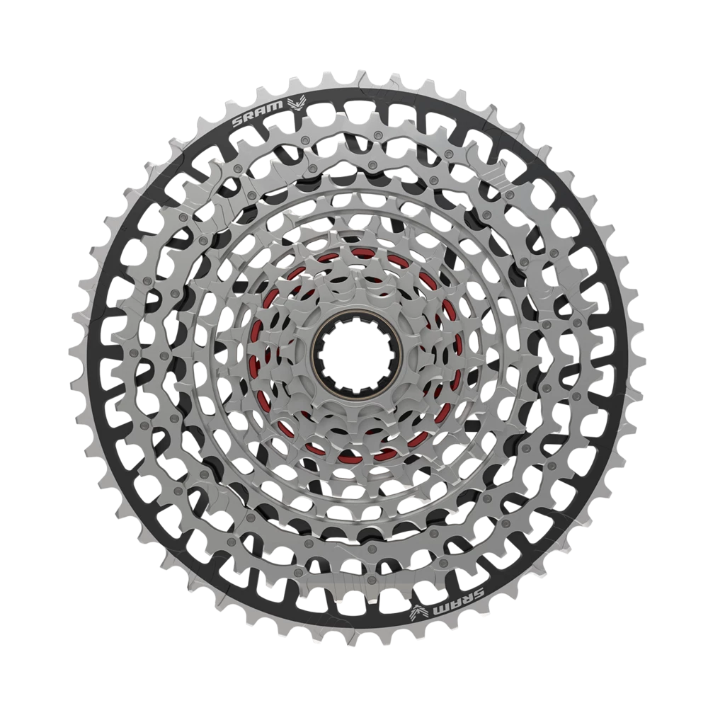 The XX Eagle Transmission (T-Type) Cassette is a major reason why Eagle Transmission offers the best-ever inboard and outboard shifting performance under load. Thanks to its full X-Sync design, the harder you pedal, the better it shifts. Literally. Engineered as integrated and interdependent transmission components, the XX Eagle Transmission Cassette and derailleur contact directly, ensuring perfect alignment on every bike. From its massive 520% gear range, the 52 tooth cog steps down with improved gear progression with 44 and 38 tooth cogs in the low end (compared to the Eagle drivetrain 10-52-tooth cassette). It lasts far longer and delivers more precision with the use of less extreme chain angles throughout the entire range. Featuring a clearly marked Setup Cog, install is both simple and fool-proof. Utilizes hardened tool steel machined X-Dome design for the cluster and stamped steel 38T and 44Tcogs are pinned to the lighter weight aluminum 12th gear. (Spider Cog)